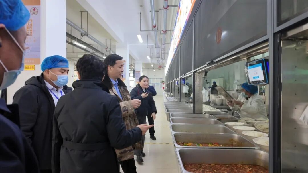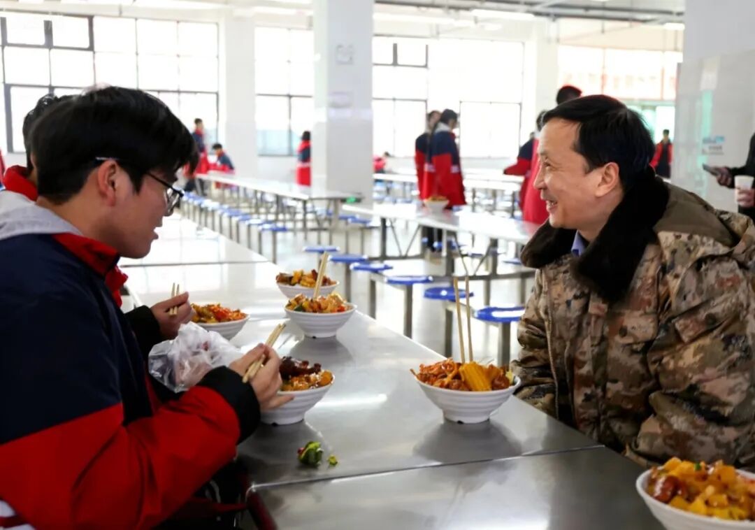 在原阳一中,调研组深入学校食堂,了解学生餐饮的营养、价格及学生满意情况,与学生亲切交流并陪餐,倾听相关意见建议。