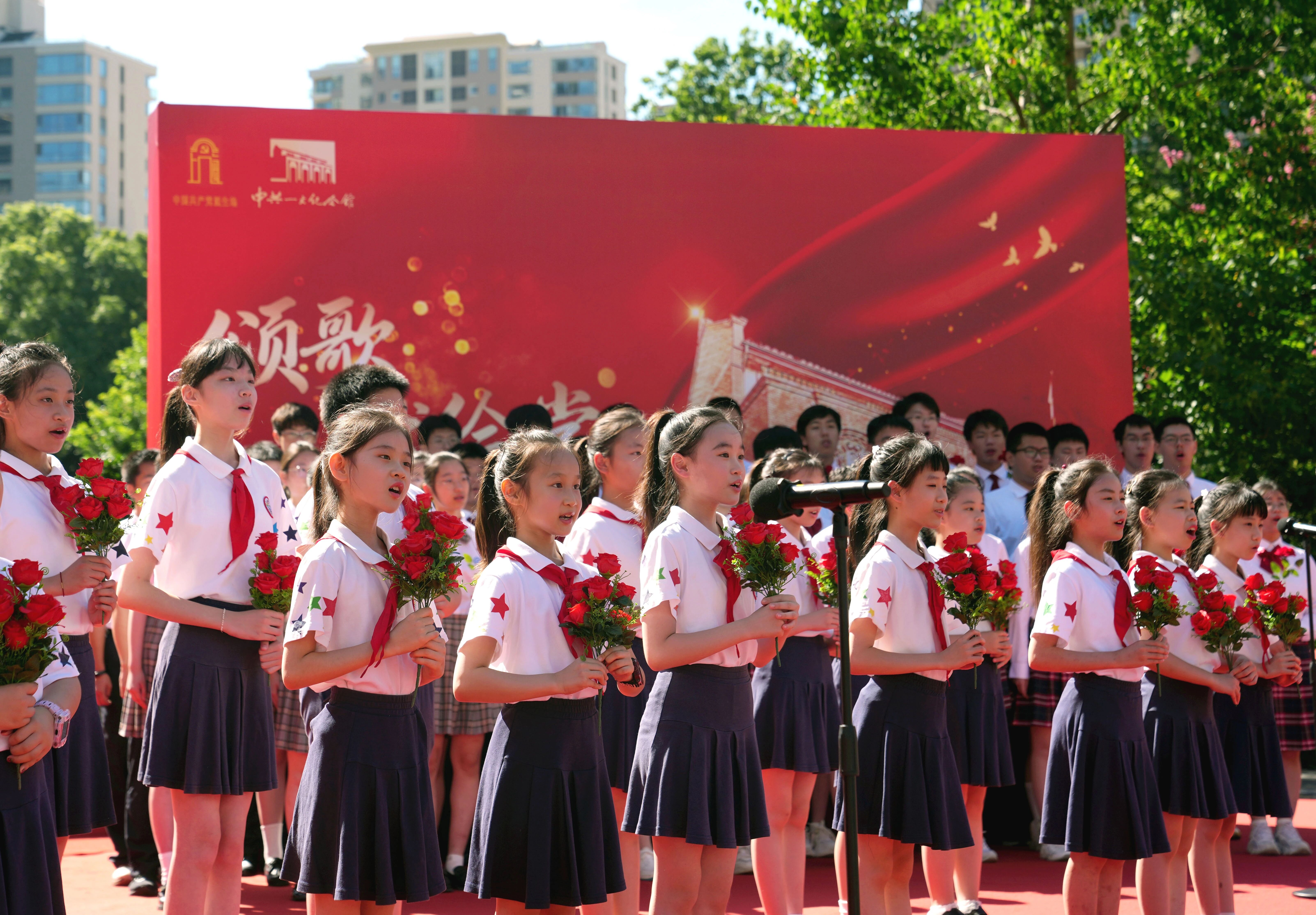 2025年7月1日,学生们在中共一大纪念馆前合唱《没有共产党就没有新中国》。新华社记者 刘颖 摄