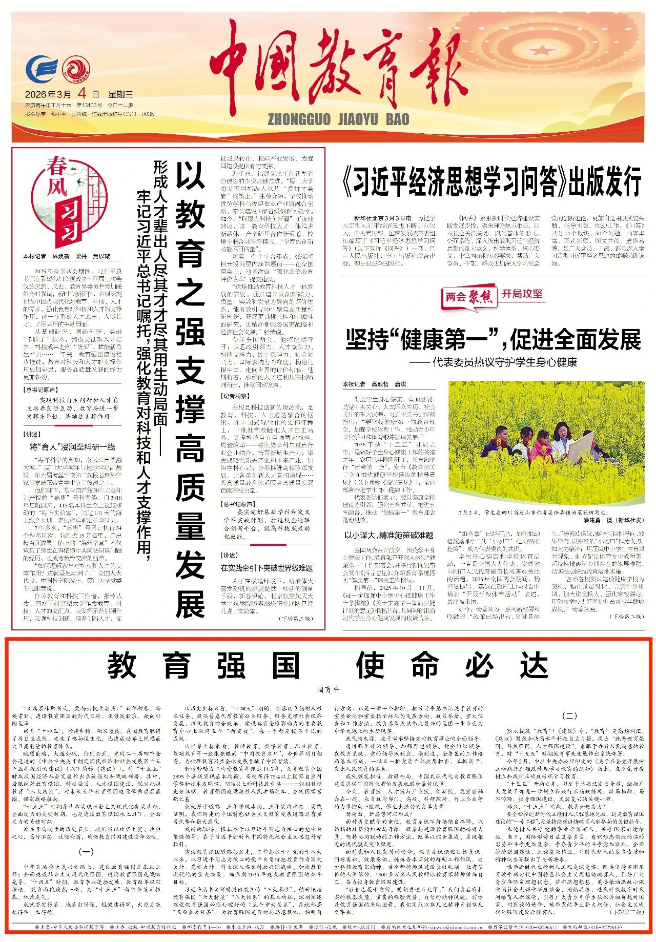 3月4日,《中国教育报》头版推出“国育平”评论文章,题为《教育强国 使命必达》,一起来看——