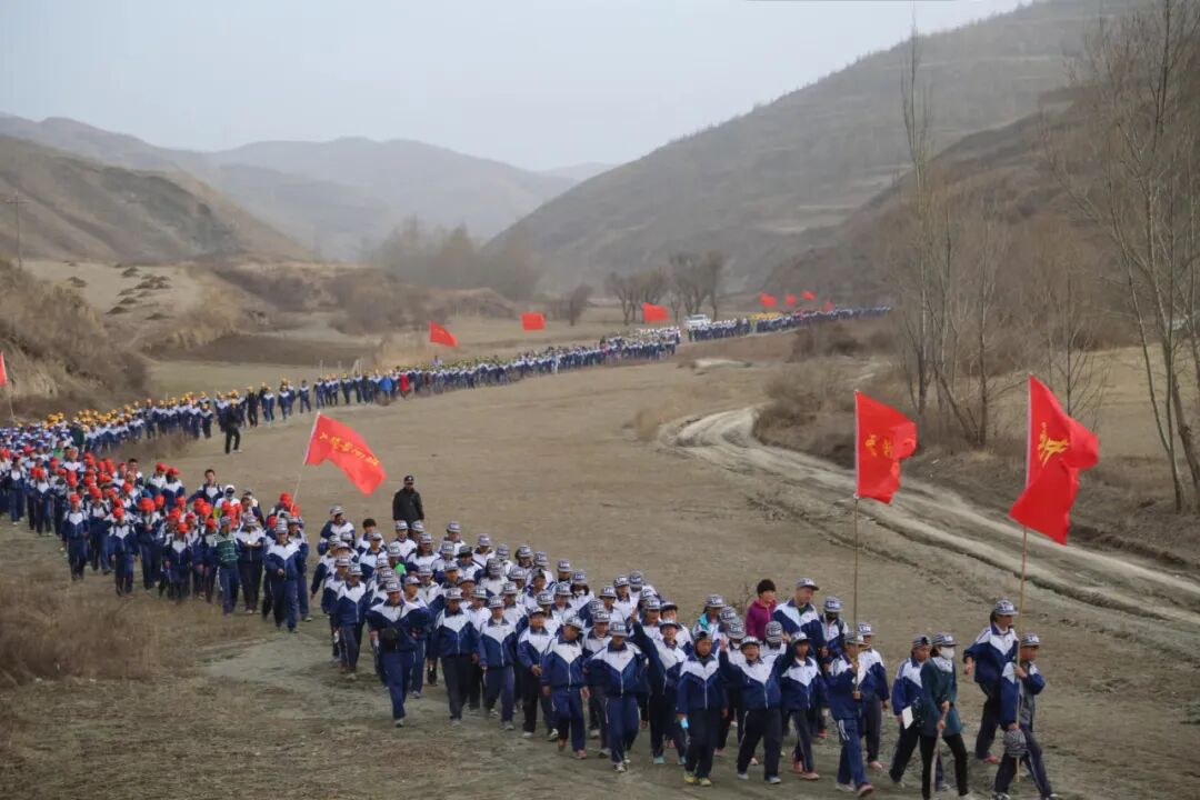宁夏固原市弘文中学七年级师生沿着崎岖的山道向任山河烈士陵园进发。王毅 摄